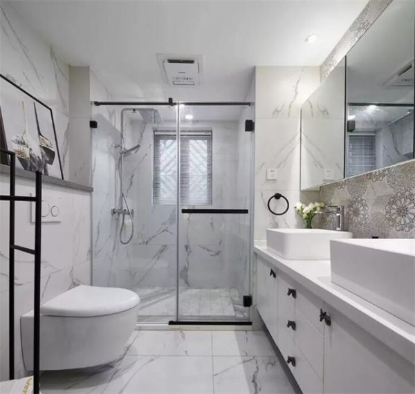 卫生间整体以白色的大理石墙地砖为基调,浴室柜和镜柜之间做了花砖来进行装饰,双洗手盆的设计也方便屋主一家日常的使用。