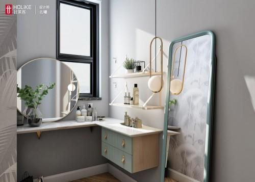 利用转角做成L型梳妆台,再搭配造型独特的搁板,可满足梳妆、收纳、展示等多种需求。