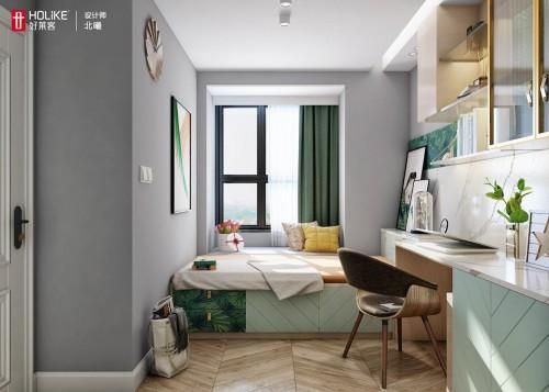 8.5㎡儿童房: 巧用垂直布局,上床下衣柜超实用 陈先生只有生一胎的打算,8.5㎡的儿童房勉强能挤下单人床、衣柜和书桌,但他还希望给孩子更多的活动空间,于是采用好莱客上床下衣柜的设计,挤出一个玩乐区。