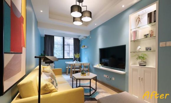 整个客厅以蓝黄为主基调,相较于之前的装修风格,改造后充满阳光与活力。