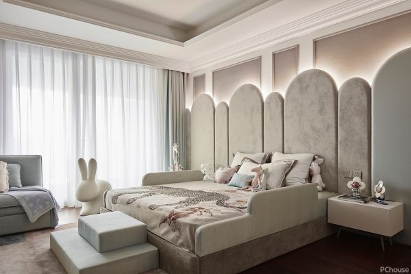 儿童房云朵形的软包床头背景浪漫而充满想象,将童趣与审美融合得恰到好处,呈现出高级的质感。从米色、浅灰到灰蓝色,色彩层次丰富。来自Qeeboo的Rabbit Chair和长颈鹿落地灯为孩子的童年时光带来天马行空的想象。