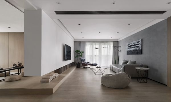 设计师融入了大量酒店设计的元素,灰白+原木色系,给人温馨而简约的居住体验。没有太多软装家具,多以硬装设计替代。无主灯+地台+半墙,无处不彰显着业主的品位和气质。